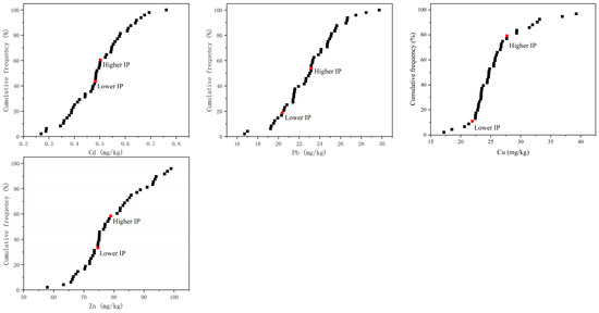 A normal distribution test for heavy metal contents was performed when abnormal values, considered as such due to being outside the 1.5-fold quartile difference, were found, and these values were gradually excluded by the use of box chart statistics (Figure 3) [40]. After eliminating anomalous data, the remaining data for the heavy metal contents could basically meet the normal distribution. After removing the abnormal points of heavy metal concentrations, the relative cumulative frequency curve of concentrations for each element was drawn, as shown in Figure 3. All the curves exhibited two inflection points (IP1 and IP2, as shown in Figure 4) based on the relationship between heavy metal contents and their relative cumulative frequency. As, Cd, and Pb showed more sample points above IP2 than the other three heavy metals, indicating that As, Cd, and Pb pollution is greatly affected by human activities in the study area. Regarding the relative cumulative frequency curves, the average value of sample concentrations below IP1 was used as the geochemical baseline value for each heavy metal. The geochemical baseline values of heavy metals in study area are shown in Table 6. Compared with the geochemical baselines of other studies in Yongqiao, the values in the study area show no significant difference from those in the coal mining area [28]. However, compared with the non-coal mining areas covering a larger area, the values in the study area are higher [27]. The reason for this difference is that heavy metal pollution caused by various human activities is widespread in the study area.