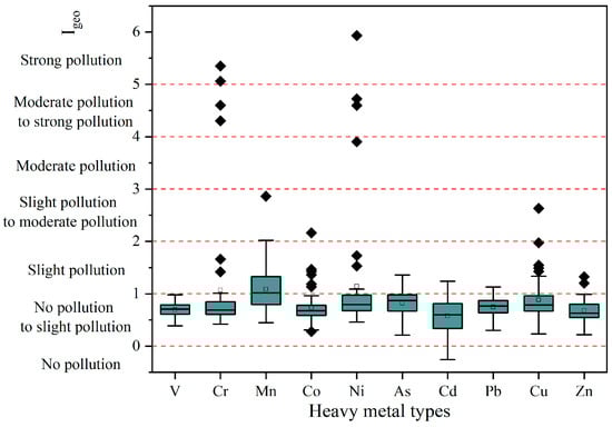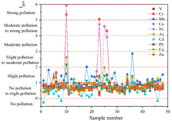The geo-accumulation index (Igeo) is a measure used to assess the pollution level of individual heavy metal elements in sediments or soils [31,32]. For each heavy metal in estuarine sediment samples, the Igeo value can be determined using the formula presented in Equation (1):