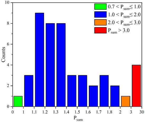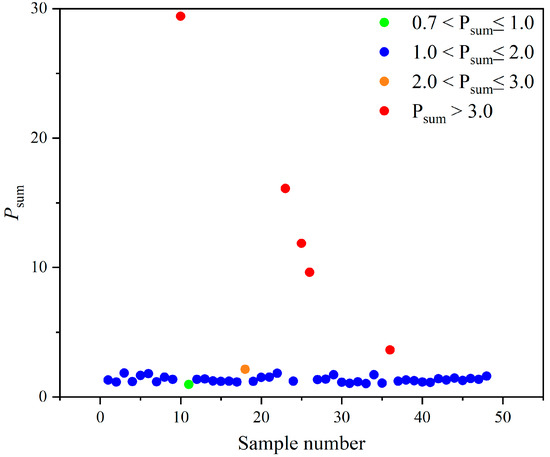 Here, is the average daily non-carcinogenic exposure dose of heavy metal i through exposure route j; is the non-carcinogenic standard exposure dose of heavy metal i through exposure route j, as defined by USEPA; and is the factor for the carcinogenic risk of each heavy metal. The values of the relevant parameters are shown in Table 4.