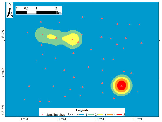 By calculating the Nemerow comprehensive index of soil heavy metals, it was found that the average value in study area was 2.68. As shown in Figure 7 and Figure 8, there are 0, 1, 41, 1, and 4 samples at Nemerow comprehensive index points of 1, 2, 3, 4, and 5, respectively. The percentages of available heavy metal contents at the warning line, light pollution point, moderate pollution point, and heavy pollution point are 2.08%, 85.42%, 2.08%, and 10.42%, respectively. Five soil samples have relatively serious heavy metal pollution. For example, two elements exceed the standard in soil sample sites 10, 24, 26, and 27, and one element exceeded the standard in soil sample site 38. Figure 9 shows a heat map for the study area, based on the Nemerow comprehensive index. Sampling site 10, with the highest grade, is located in a farmland area, within which it is possible that the improper use of pesticides has caused severe heavy metal pollution. The Igeo values and the results derived from using the Nemerow comprehensive index are consistent, with both sets of results indicating that these sites have been polluted. Compared with the research results of Yuan et al., the study area has been affected to a certain extent by the Zhuxianzhuang Coal Mine, and the traffic demand caused by the mining area’s production is one of the reasons for the heavy metal pollution in the study area [41]. Although the farmland near the coal mine has been polluted to a certain extent, the overall pollution risk level is relatively low.