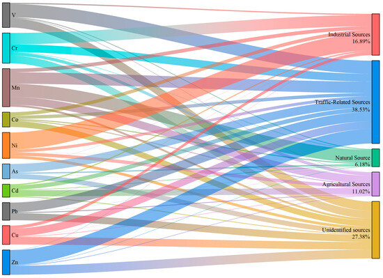 The APCS-MLR model resolved four dominant sources: industrial sources (16.89%), traffic-related sources (38.53%), natural sources (6.18%), and agricultural sources (11.02%). Overall, 27.38% of the total pollution load was attributed to unidentified sources, potentially associated with unmonitored informal industries or heterogeneous background inputs.