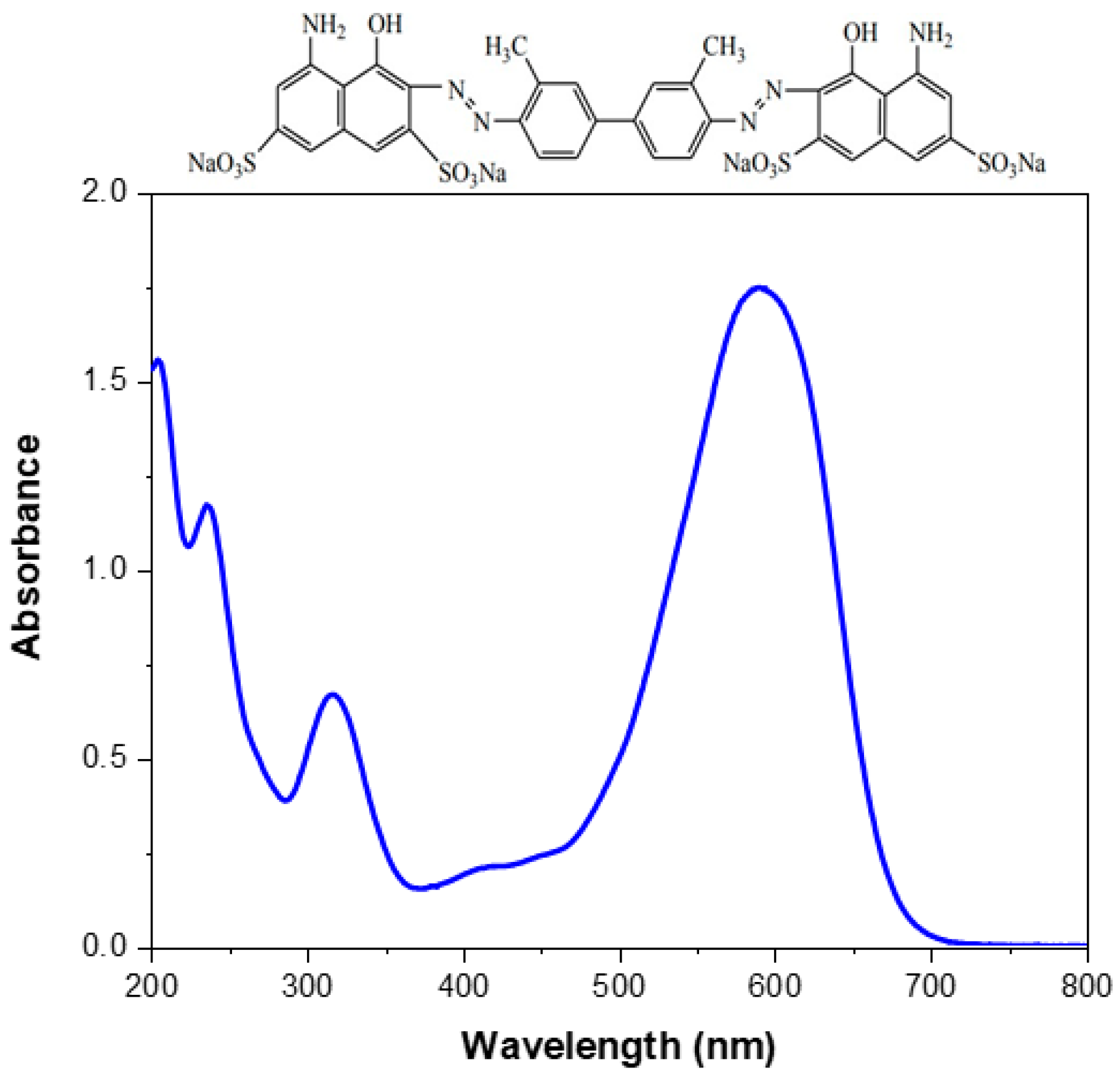 - Graham, J.P.; Rauf, M.A.; Hisaindee, S.; Nawaz, M. Experimental and Theoretical Study of the Spectral Behavior of Trypan Blue in Various Solvents. J. Mol. Struct. 2013, 1040, 1–8. [Google Scholar] [CrossRef]