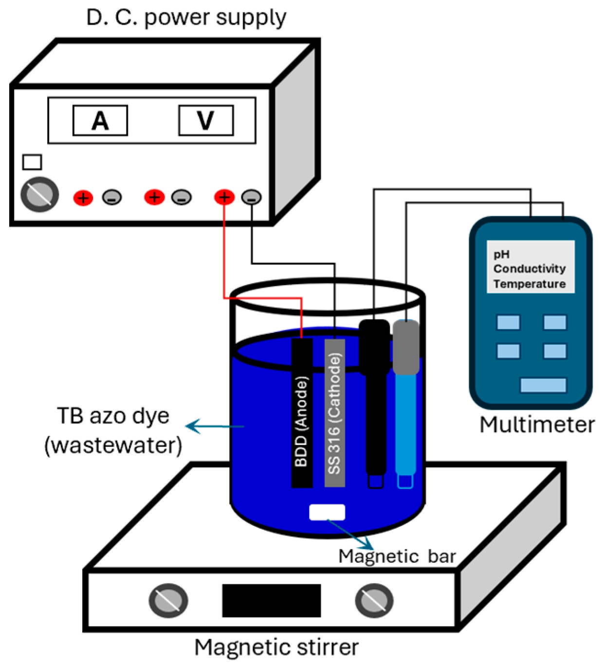 - Gasmi, I.; Gadri, A.; Guenfoud, M. Electrochemical Oxidation of Textile Wastewater on BDD Anode: Kinetics, Degradation Pathway, and Energy Consumption. ACS Omega 2022, 7, 19792–19804. [Google Scholar] [CrossRef]