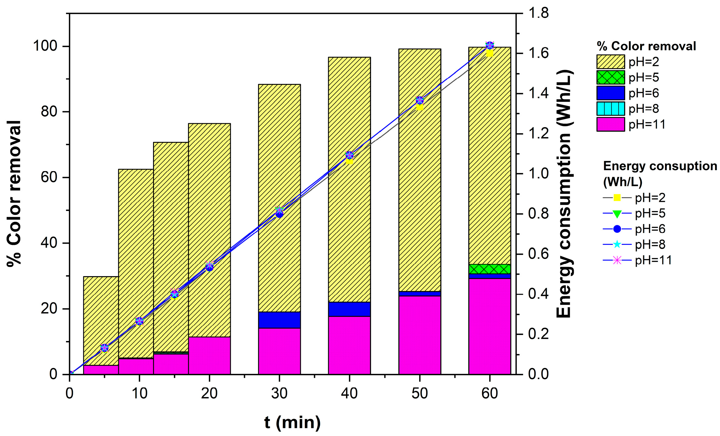 - Ramírez, C.; Saldaña, A.; Hernández, B.; Acero, R.; Guerra, R.; Garcia-Segura, S.; Peralta-Hernandez, J.M. Electrochemical oxidation of methyl orange azo dye at pilot flow plant using BDD technology. J. Ind. Eng. Chem. 2013, 19, 571–579. [Google Scholar] [CrossRef]