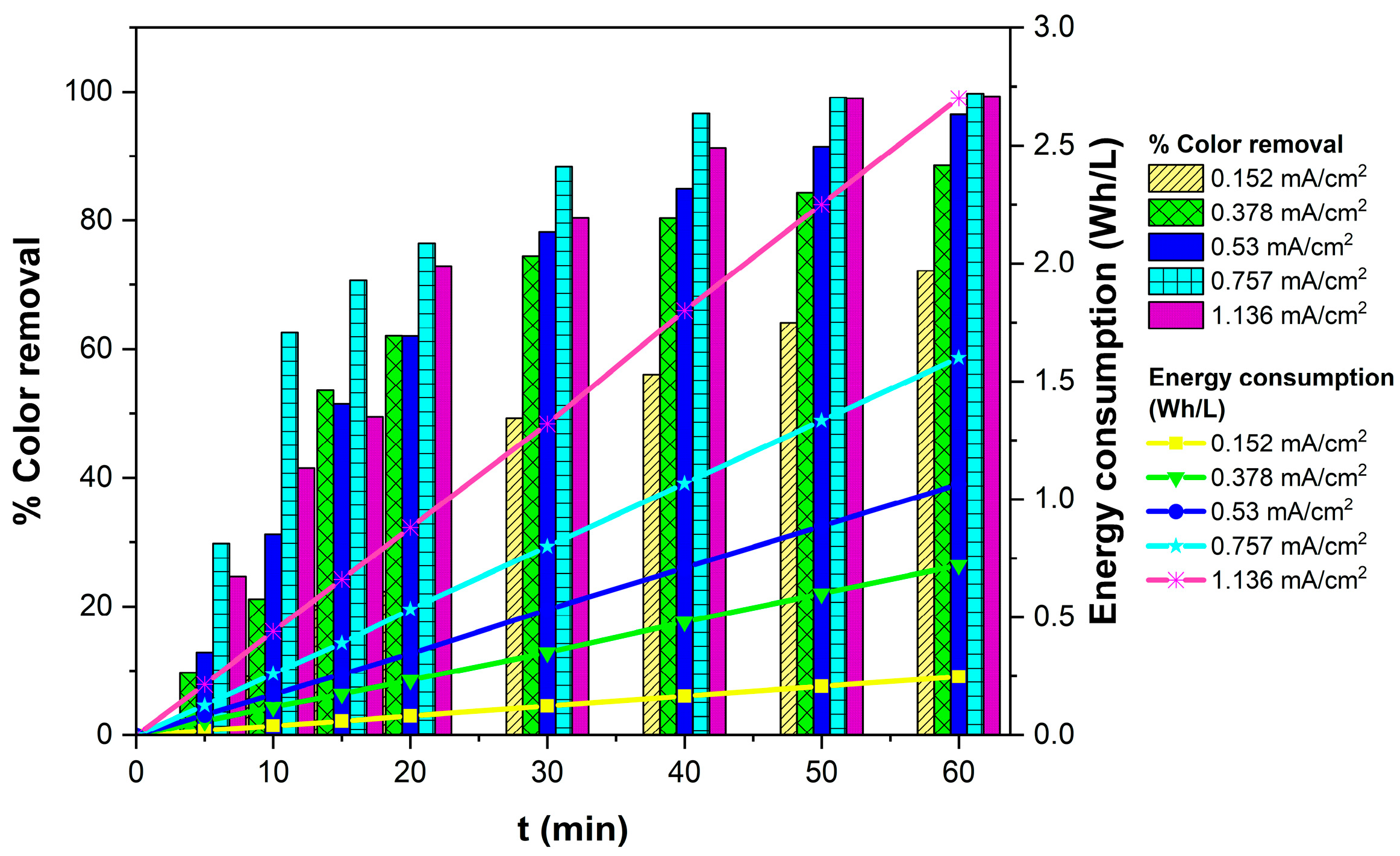 3.1.3. Effect of Current Density on TB Removal Efficiency and Energy Consumption