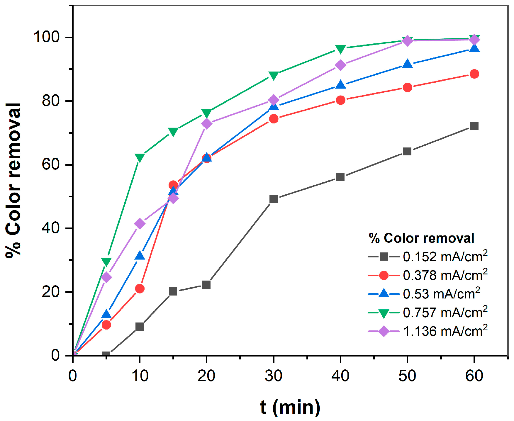 - Villabona-Ortíz, A.; Tejada-Tovar, C.; Navarro-Romero, D. Evaluation of parameters in the removal of azo Red 40 dye using electrocoagulation. S. Afr. J. Chem. Eng. 2024, 50, 100–108. [Google Scholar] [CrossRef]