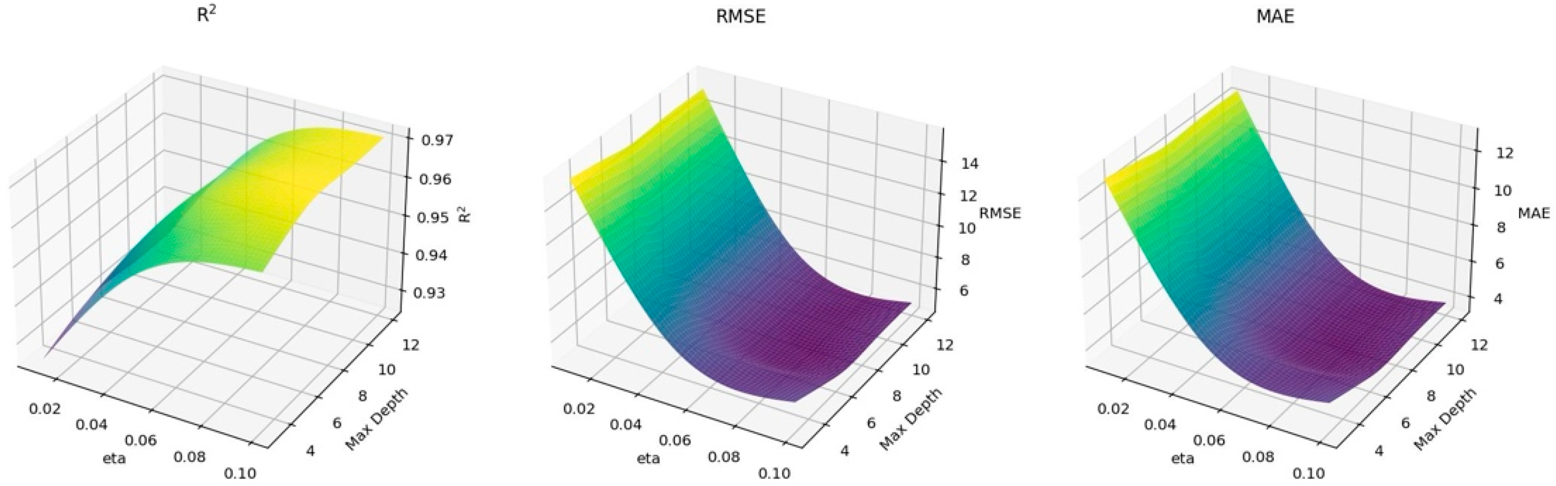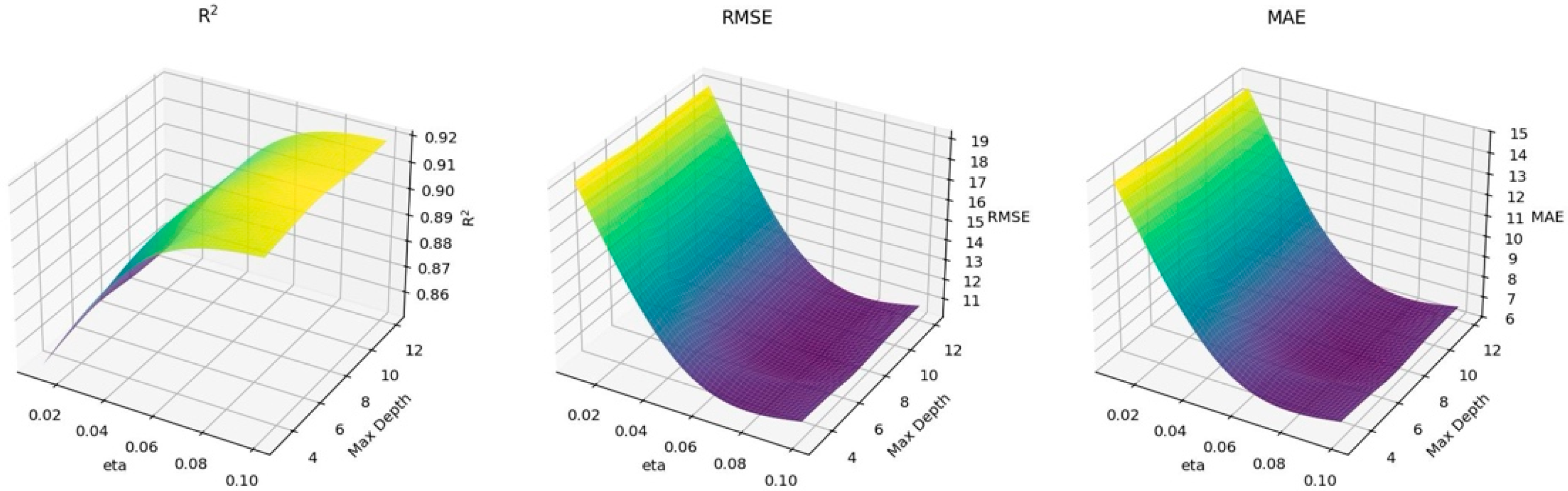 - Max Depth: It refers to the maximum depth of decision trees. As the depth of the tree increases, the model’s capacity to learn complex relationships increases, while the risk of overfitting also increases [35].