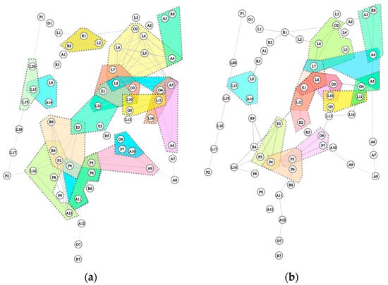 Comparative analysis of local cliques within the public space network of Xiongfan Village: (a) “Public Space Structure Network” (Na); (b) “Villagers’ Space Usage Behavior Network” (Na′).