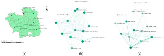 Township network comparison: (a) Location of towns and villages within the township’; (b) “Township Original Network” (Nb′); (c) “Township Construction Network” (Nb).