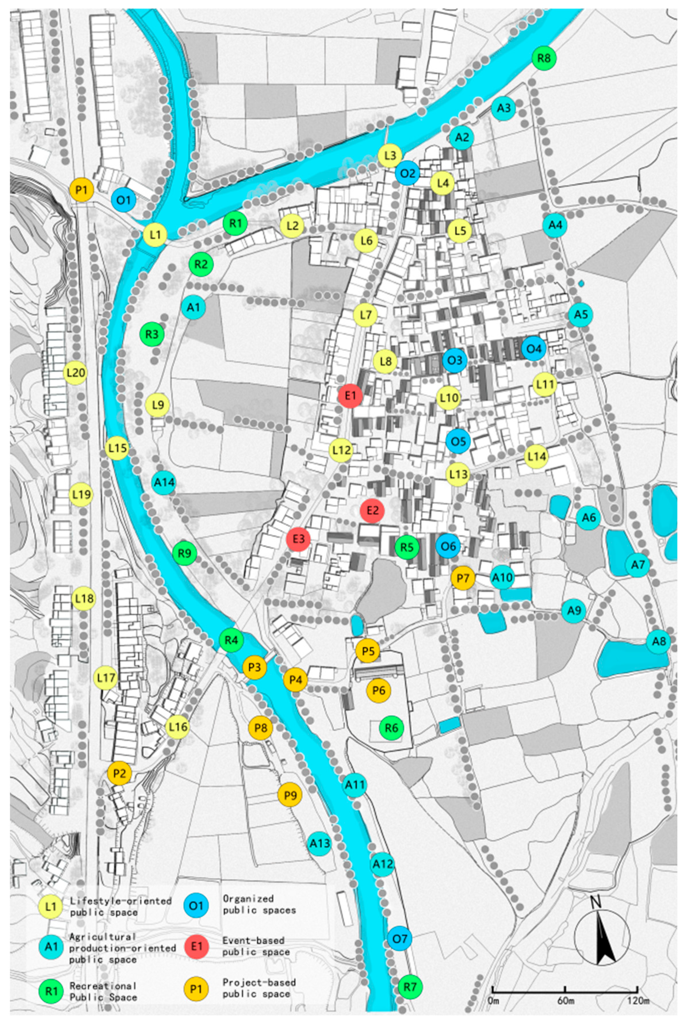 | 18 | L1 | North Village Entrance Bridge | Lifestyle-oriented public space: Spaces generated by villagers’ daily interactions and closely related to their daily lives, such as laundry docks and small shops. | 49 | P5 | Village History Museum | |
