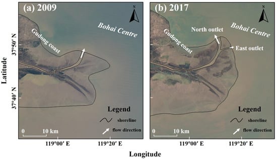Comparison of the YRE and the coastline of the YRD in (a) 2009 and (b) 2017.