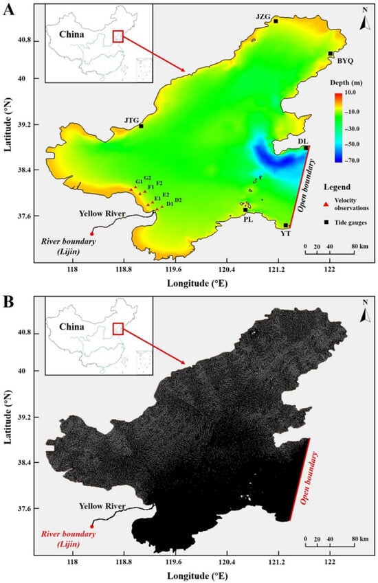 The location below Lijin station of the Yellow River and Bohai Bay. (A) Depth, tidal stations, and locations of fields observations; (B) model grid and model boundary position.