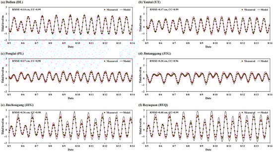 The tide level validation simulation period was from 00:00 on 1 June 2017, to 00:00 on 1 September 2017, using data from August, after the simulation results had stabilized. Tide level validation data were obtained from tide tables (2017). Tide table data from mid-to-early August were compared with the simulation results presented in this paper. As shown in Figure 3, the RMSE of tide levels at each tide station ranged from 0.14 to 0.40 m, with an average error of 0.27 m. The correlation coefficient (CC) for each tide station exceeded 0.96, indicating that the model calculation results are in good agreement with tide level data from tide stations around the Bohai Sea.