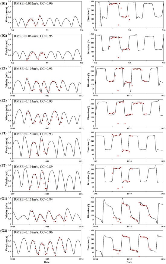 Tidal current validation was conducted from 00:00 on 1 June 2009, to 00:00 on 30 October 2009, using data from early July and mid-October, after the simulation stabilized. The results show good agreement between the flow directions calculated by the model and the measured flow directions. The calculated velocities at each tidal station differed little from the measured velocities, with RMSE ranging from 0.067 to 0.191 m/s. The correlation coefficients (CC) were all greater than 0.93, except for points F2 and G1, where they ranged from 0.84 to 0.89, indicating good correlation (Figure 4). Among them, D1-G2 is the corresponding sampling point position in Figure 2A.