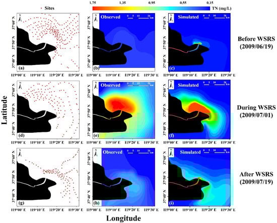 Comparisons of the simulated and measured TN concentrations in the YRE. Scatter point extraction of TN concentration in YRE (a) before, (d) during, and (g) after the WSRS. The measured concentration of TN in the YRE (b) before, (e) during, and (h) after water and sediment regulation was obtained by kriging interpolation. The simulated value of TN content distribution in the YRE (c) before, (f) during, and (i) after water and sediment regulation.