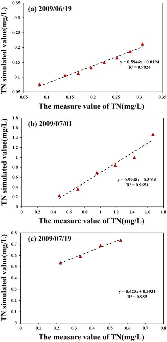 Comparison of TN measured value and simulated value (a) before the WSRS, (b) during the WSRS, and (c) after the WSRS. The red symbol points are the comparison between the simulated values and the measured values, and the black dotted line are the fitting relationship lines between the simulated values and the measured values.