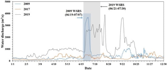 Daily average water discharge at Lijin Station, 2009, 2017, and 2019.