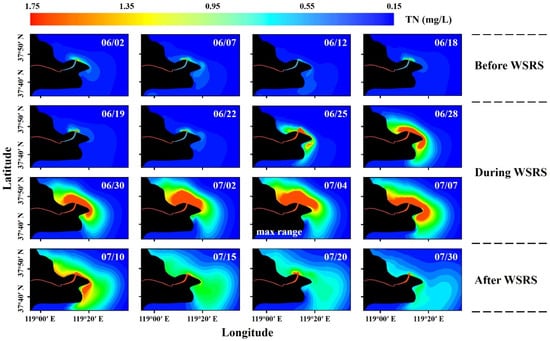 TN concentration distribution before, during, and after the WSRS in the YRE in 2019.
