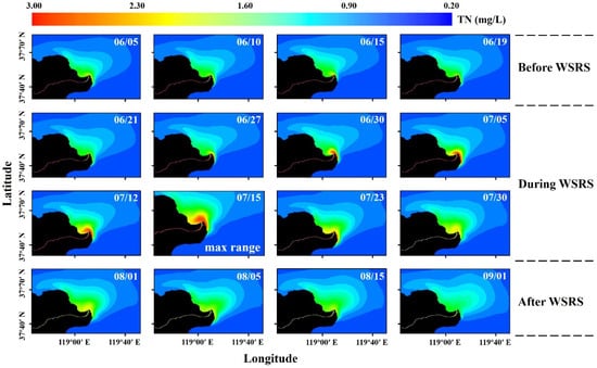 - For the years with the WSRS (2009 and 2019), the farthest diffusion distance of the high-concentration-TN water body is basically consistent with the edge of the estuary plume. In 2009, it was about 30 km to the southeast side of the estuary, and in 2019, it was about 26.5 km to the north side of the estuary. At 25–26 °C, TN concentrations of 0.5 mg/L (2009) and 1.05 mg/L (2019) can be used as the threshold for the longest diffusion distance to different river channels.