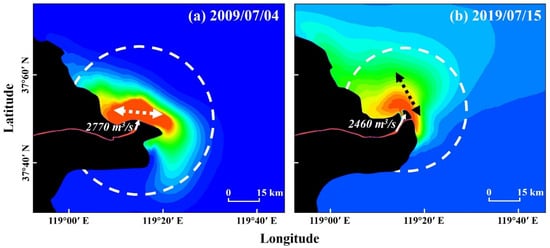 Estuarine plume is a common form of estuarine material transport to the sea, which is manifested as high-concentration and low-salinity water bodies floating above the sea [9]. The spatial and temporal variations in plumes have a direct impact on the distribution of suspended solids, nutrients, pollutants, and nitrogen-cycling processes in the estuary and its adjacent waters [41]. Thus, the estuarine plume affects the geological, chemical, biological, and physical marine environment of the estuary and its adjacent waters. Based on the temperature data of the YRE from 2002 to 2013, the previous study has calculated the relationship between the plume diffusion distance and runoff during the WSRS [42]. Based on their empirical relationship [42], we calculated the relationship between the diffusion range of high-TN-concentration water and estuarine plume distance in 2009 and 2019, respectively (Figure 10). When the runoff reached 2770 m3/s in 2009, the diffusion range of high-TN-concentration water (>0.5 mg/L) in the estuary was close to the edge of the plume, which was about 30 km away from the southeast side of the estuary (Figure 10a). The diffusion range of high-TN-concentration water (>1.05 mg/L) in 2019 is close to the edge of the plume, about 26.5 km north of the estuary (Figure 10b). In addition, the sea surface temperature corresponding to the farthest transmission distance of the estuarine plume is about 25–26 °C [42]. Therefore, according to the simulation results in this paper, the TN concentrations of 0.5 mg/L (2009 river channel) and 1.05 mg/L (2019 river channel) can be used as the threshold of the farthest transmission distance of different flow paths at this temperature (Figure 10).