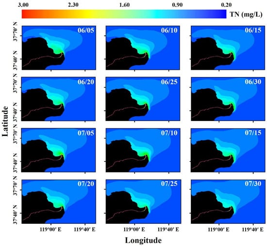 Since the implementation of the WSRS in 2002, it has continued to be implemented in all years except for 2016 and 2017, when it was suspended due to a significant reduction in upstream water and sediment discharge. In addition, the river channel of the YRD was basically unchanged from 2017 to 2019. Therefore, these two years can be used to explore the influence of the years with or without the WSRS on the TN diffusion range in the YRE. Overall, TN concentration in the YRE was lower than 2 mg/L from June to July 2017. The water with high TN concentration was mainly distributed in Gudong coastal areas, which came from the north outlet of the YRE. The water from the east outlet is distributed southward under a tidal current within 1.5 km of the coast. It can be seen that the TN diffusion range is obviously smaller in the year without the WSRS (2017) than in the year with the WSRS (2019). Some previous studies reported that riverine freshwater is one of the most dominant nutrient sources in the YRE [43,44]. From 5 June to 15 June in 2017, water with TN concentration higher than 1 mg/L diffused from the estuary to the north by about 2.17 km, with an area of about 38.7–45.2 km2. However, the northward diffusion range of TN in 2019 was about 3.4 times (7.38 km) that in 2017. (Figure 9, Figure 11). By comparing the average runoff from 5 June to 15 June over these two years, it was about 2.7 times higher in 2019 than in 2017. These results show that runoff is also an important factor that determines the range of TN diffusion.