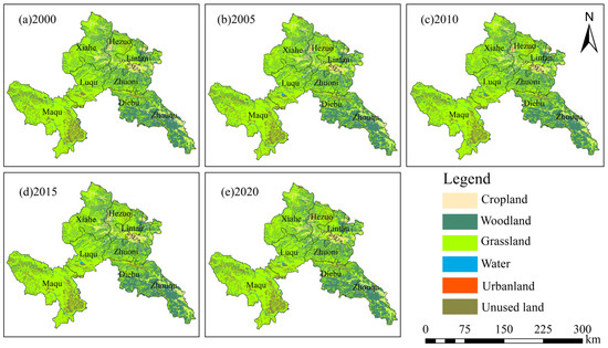 With respect to spatial distribution characteristics, grasslands are predominantly found in the west, where the plains and plateaus are situated. Woodlands are mainly distributed in the mountainous areas in the south and east. Urban lands are concentrated in counties and cities, with unused lands scattered around them. Water mainly belongs to the Yellow River and the Taohe basin, interspersed and distributed in Gannan. Unused lands are scattered in Maqu.
