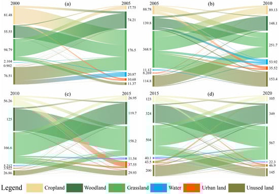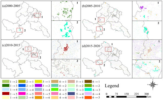 Based on the landscape type shift analysis, the results for the four periods (2000–2005, 2005–2010, 2010–2015, and 2015–2020) displayed the following.