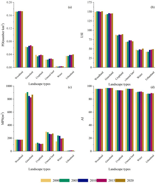 Figure 6a). The trend of unused land and woodland was consistent. All other landscape pattern types had PD values < 0.1. The PD values for grassland exhibited a trend of decrease–increase–decrease, with a peak of 0.0683 reached again in 2015, and the trend in values for cropland and water was consistent with it. The value for urban land, on the other hand, illustrated a continuous upward trend, reaching a maximum value of 0.0403 in 2020.