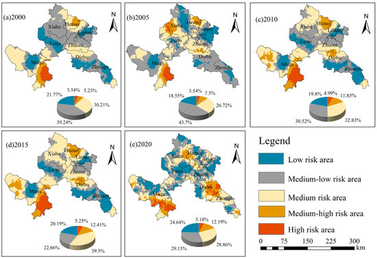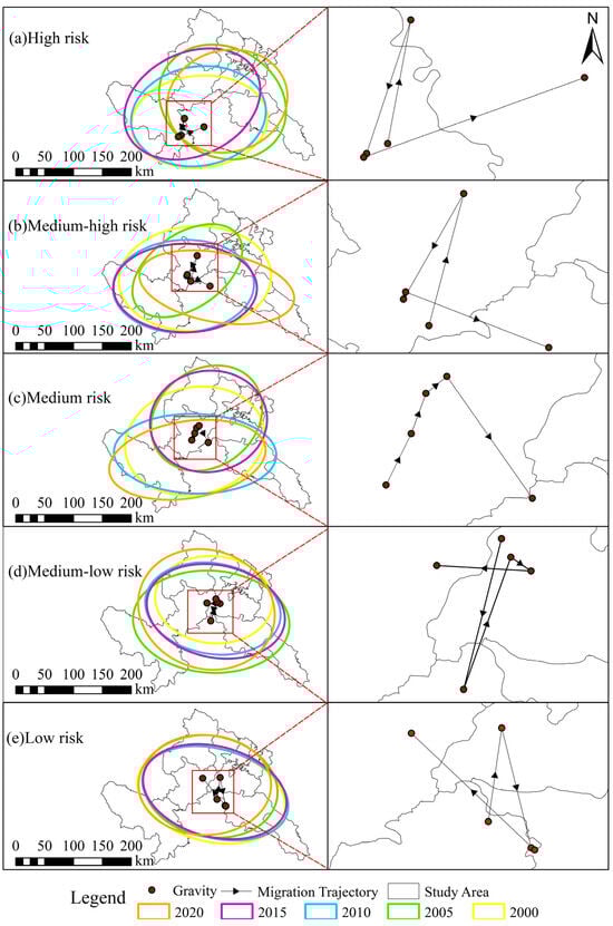 Collectively, high-risk areas developed with southwestern bias yet demonstrated a northeastward migration trend from 2000 to 2020. Low risk and moderate–low-risk areas exhibited pronounced westward development trends. These three risk levels exhibited decreased dispersion. In contrast, medium risk and medium–high risk areas developed northward with increased dispersion.