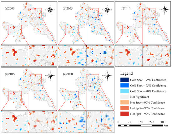 p-value for the hot spot areas (Z(Gi) > 1.9) was 0.02, while that for the cold spot areas (Z(Gi) < −1.9) was 0.03, both demonstrating statistical spatial significance. The LER hot spots in the GN region were predominantly concentrated in urban areas, such as the urban core of Hezuo, Oula Town in Maqu, and the urban zones of Luqu and Zhuoni. Anthropogenic construction of towns and industrial parks has exerted substantial ecological pressure. In contrast, cold spots were less abundant than hot spots and were primarily located within ecological protection zones and plateau wetland areas. Furthermore, a comparison of the LER cold and hot spot distributions across the five periods revealed that the number of hot spot clusters in 2020 was significantly lower than in the previous four periods, whereas the number of cold spot clusters was markedly higher. This denotes a positive trend in the LER status of the GN region.