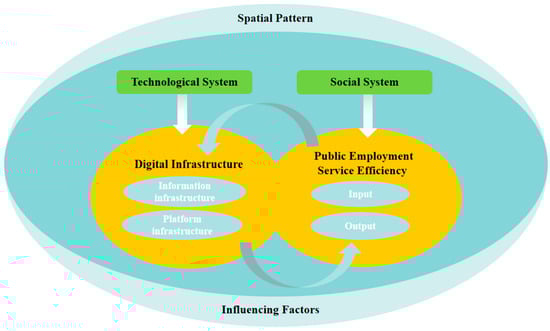 Public employment services are the core components of public service systems. Such services refer to a series of service-oriented works led by the government and involving all sectors of society. Through employment service agencies, employment services help workers obtain job positions and enhance their employability and assist employers in finding a qualified labor force [,]. Currently, China has basically established a relatively complete public employment service system. Data released by the Ministry of Human Resources and Social Security shows that public employment service agencies have been generally established at or above the county (district) level in China. On average, public employment and talent service agencies at all levels provide recruitment services for approximately 80 million laborers and 50 million employer entities annually. However, with the dramatic development of digital technology, the human resource market is changing profoundly, and it has been difficult for the traditional modes of public employment services, such as on-site job fairs, job training centers, and job introduction agencies, to meet the labor force’s employment needs [,]. Traditional public services are often viewed as a one-way process of public sector supply and passive consumption by the masses, whereas the extensive utilization of digital infrastructure in the public employment services sector can break down the barriers between supply and demand and facilitate the precise matching of supply and demand [] and enhance the efficiency of public employment services. Moreover, the synergistic development of digital infrastructure construction and public employment service efficiency can promote the innovation and upgrading of digital technology and enhance the sustainability of digital infrastructure [,]. Therefore, systematically exploring the relationship between digital infrastructure and public employment service efficiency holds significant research value for achieving the digital transformation of the public service system and promoting sustainable social development.