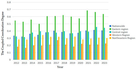 The results for each subregion reveal that the growth rates of the coupling coordination degree between digital infrastructure construction and public employment service efficiency in the eastern, central, western, and northeastern regions from 2012 to 2023 were 16.67%, 37.35%, 24.04%, and 6.71%, respectively, with the average coupling coordination degree of these regions ranked as follows: eastern > central > northeastern > western. These findings indicate that although all regions of China are developing rapidly in terms of both digital infrastructure construction and public employment service efficiency, there remain significant regional differences in the coordinated development of Chinese digital infrastructure and public employment services, which is manifested as the eastern region possessing an absolute advantage, the central region leading in growth, the northeastern region showing sluggish growth, and the western region lagging behind. The eastern region continues to lead in average growth rates, but its pace of growth is slowing, indicating that this eastern region has entered a mature phase of coordinated development. The eastern region’s high average is attributed to its first-mover advantage in digital infrastructure construction and the digitization of employment services. However, the decreasing growth rate may be constrained by diminishing marginal returns, such as the gradual saturation of digital infrastructure in core cities. Additionally, the pressure from industrial upgrading is a significant factor, and the industrial development model needs to shift from past-focused scale expansion to quality-driven deepening. The central region’s leading growth rate confirms that its late-mover advantage is being fully realized. By leveraging industrial transfers from the eastern region, capitalizing on the policy dividends of the Central Region Rise strategy, and benefiting from a relatively low starting point for coupling coordination, the central region has achieved rapid growth in the coordinated development of digital infrastructure and public employment services. In contrast, the stagnant growth of the northeast region exposes the challenges of structural transformation. The region’s high reliance on traditional industries and its severe population outflow have led to insufficient demand for digital infrastructure and weak momentum for the digitization of employment services, creating a vicious cycle of low growth—low average in the coupling coordination of digital infrastructure and public employment service efficiency. The western region has seen notable growth rates but lags behind in average levels, reflecting the initial emergence of catch-up effects but weak foundations. The western region has benefited from the East Data–West Computing program and the Western Development strategy, with faster growth in the coordinated and sustainable development of digital infrastructure and public employment service efficiency. However, owing to low starting points and geographical constraints, absolute levels remain lagging.
