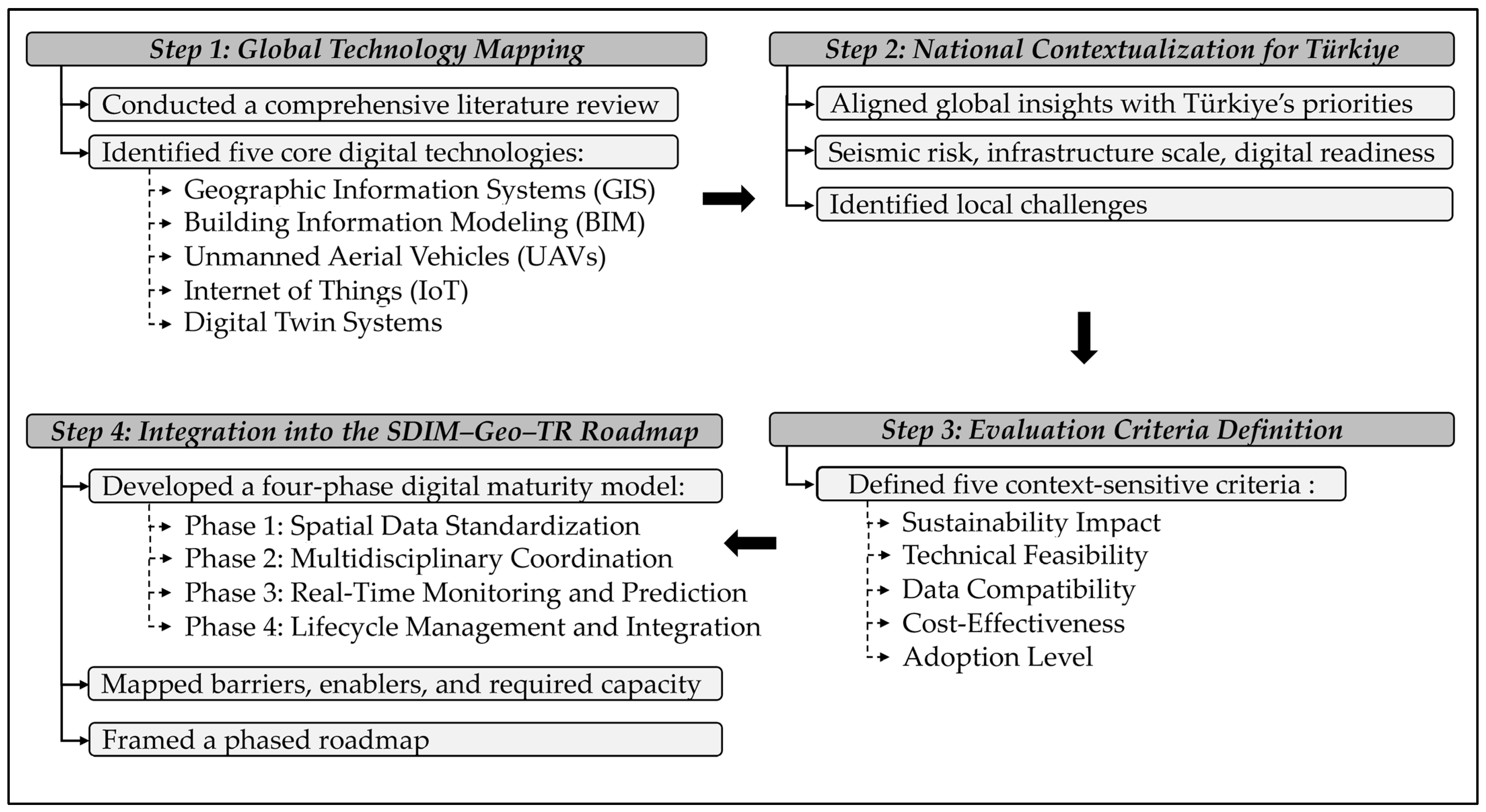 Barriers identified across the reviewed studies include lack of interoperability (e.g., GIS–BIM data transfer), high costs (e.g., digital twins), and limited digital literacy among stakeholders. The SDIM–Geo–TR framework provides a structured response by offering: