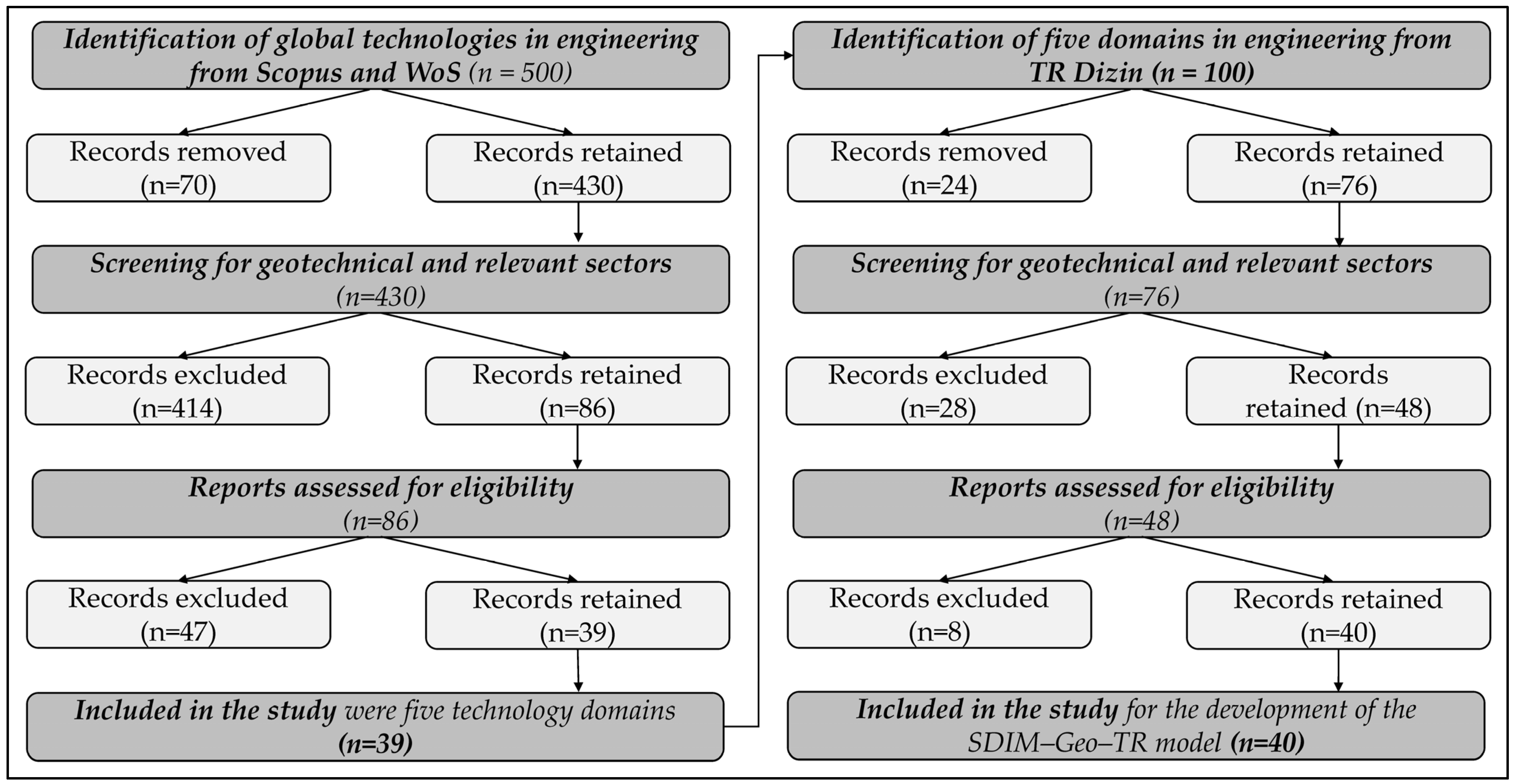 Step 1—Global Technology Mapping: An extensive literature review was conducted using Scopus and Web of Science for international sources. The search employed combinations of the following keywords: “digital transformation,” “geotechnical engineering,” “GIS,” “BIM,” “UAV,” “IoT,” and “Digital Twin.” Boolean operators (“AND,” “OR”) were applied, and results were filtered to include only peer-reviewed journal articles published in English. Studies were retained if they explicitly addressed geotechnical engineering or geotechnical-related infrastructure applications. Exclusion criteria involved conference abstracts, review-only papers without implementation cases, and studies lacking relevance to engineering practice. The initial screening identified over 500 international studies, from which 86 met the inclusion criteria. Among these, 39 studies were selected for in-depth synthesis based on content richness, diversity of technological integration, and practical relevance.