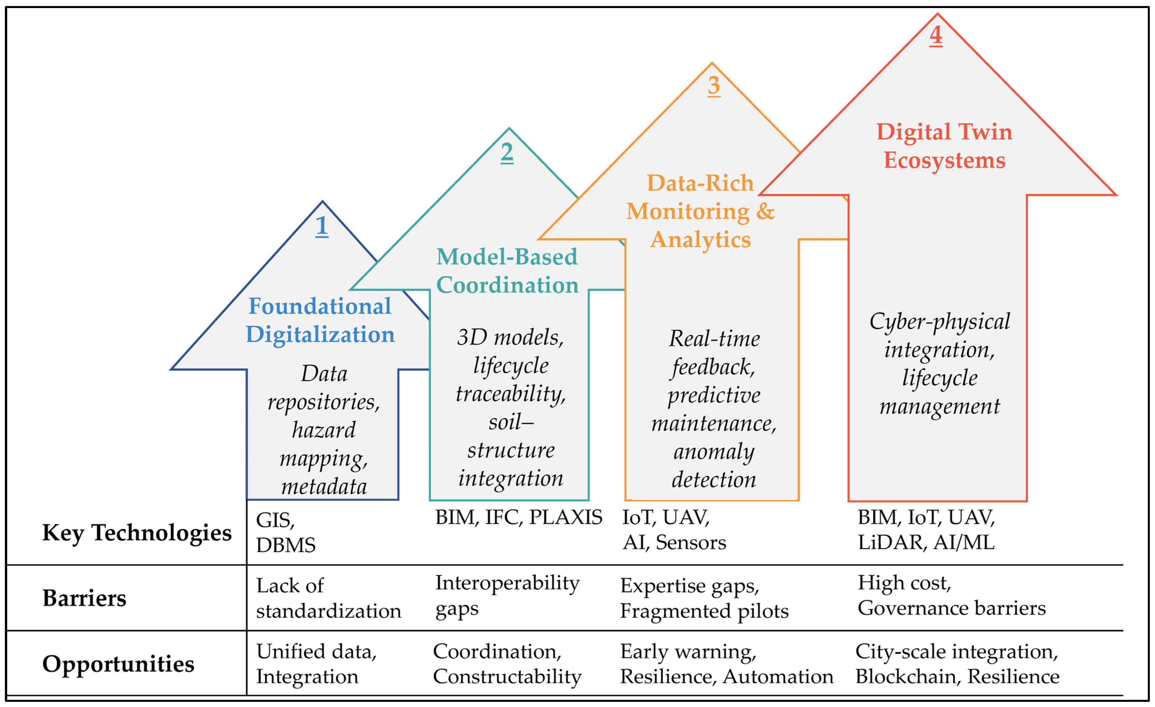 The reviewed studies collectively propose a phased roadmap for integrating digital technologies into geotechnical-related practice in Türkiye. A first step involves consolidating foundational platforms such as GIS and BIM, which provide essential capabilities for data management and spatial analysis. The next stage builds on these foundations by incorporating more advanced technologies, including UAVs, IoT, and digital twin, to enhance monitoring accuracy, automation, and predictive analytics. Ultimately, the trajectory culminates in comprehensive digital twin systems with real-time monitoring capabilities, enabling proactive risk management and lifecycle sustainability. Interoperability and data standardization are consistently highlighted as prerequisites for achieving this progressive integration.