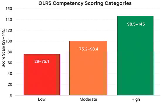 The original version of the OLRS was developed in Turkish. For transparency and to facilitate evaluation of the instrument’s validity and content, a translated English version of the scale (including sample items for each dimension) is provided in Appendix A, following a translation–back-translation procedure to ensure linguistic and conceptual equivalence. The OLRS consists of 29 items rated on a 5-point Likert scale, ranging from 1 (Strongly disagree) to 5 (Strongly agree). To simplify interpretation, total scores (29–145) and subscale scores were grouped into three categories: low, moderate, and high. Based on the OLRS scoring framework, teachers’ competency levels were classified into low, moderate, and high categories. To enhance clarity, the scoring thresholds are summarized visually in Figure 1. While total and sub-factor scores are derived from the same scale, we report them separately to capture domain-specific patterns (e.g., planning vs. evaluation) that may have practical implications for teacher training. For instance, a teacher may demonstrate strength in planning but require support in implementation. Recognizing such profiles can inform targeted interventions.