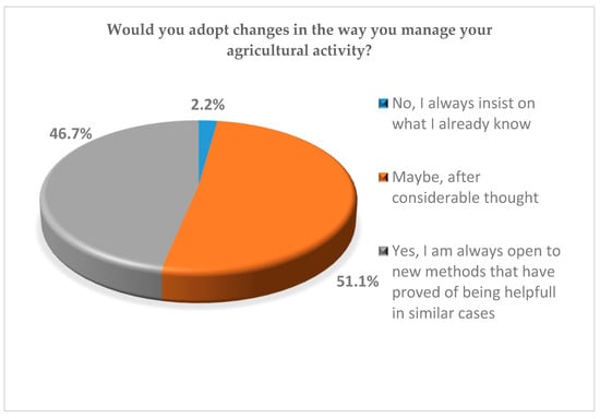 Finally, in (Figure 1) we present the results concerning their intention to change and adopt, that is if they have the intention to adopt changes in the way they manage their agricultural activity. A vast percentage of 51.1% claimed to be open and eager to adopt new ways, ideas and methods in their farming practices in order to enhance their productivity with respect to sustainability. Another 46.7% were more skeptical and stated they would only do so after considerable thought. These findings clearly suggest the need to further inform, educate and communicate the benefits of sustainability and the great impact that new farming methods should have on their agricultural activity in order to foster the change that is crucial for the future of agriculture.