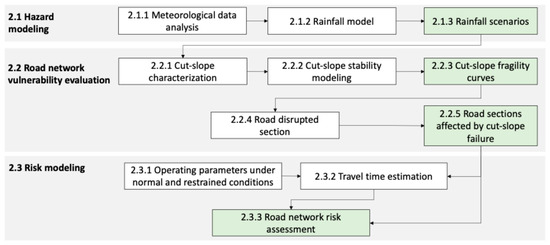 Figure 1 shows the methodology to estimate the risk of precipitation-induced cut-slope failure in the road network. It considers three steps: (1) Hazard modeling; (2) Road network vulnerability evaluation; and (3) Risk assessment.