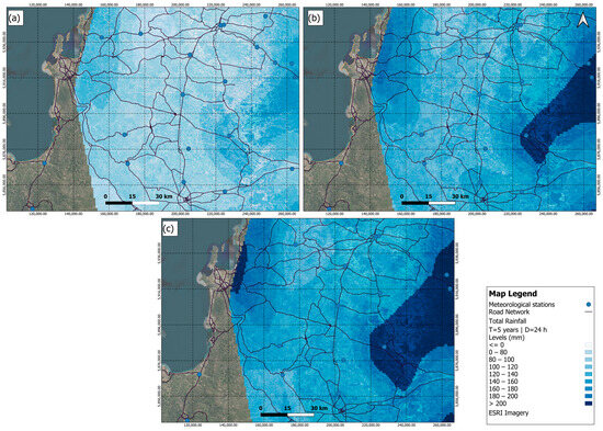 Graphical representation of the total rainfall (in mm) for a 24 h rainfall event for return periods of (a) 5 years, (b) 50 years, and (c) 100 years.