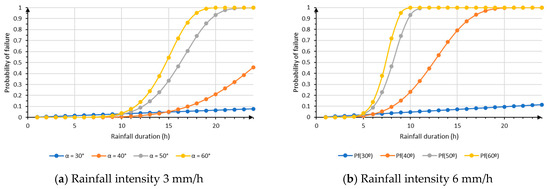 Subsequently, the probability of slope failure was estimated based on the duration and intensity of the rainfall events. This estimation utilized the precipitation data derived from the maps presented in Figure 3 and the cut-slope location detailed in Figure 2. The curves plotted in Figure 4, adopted from Jiménez-Ramos et al., [24], were used to estimate the probability of failure in the cut-slopes of the study area. These curves are parameterized only by slope inclinations α ranging from 30° to 60°, which implicitly considers the predominant soil type of the slope. The development of these curves inherently includes the variability of soil strength parameters through probabilistic analysis as indicated in Jiménez-Ramos et al. [24]. Their analysis used the probability distributions of soil parameters proposed by Sivakumar Babu and Muthi [56] including a wide range of potential soil behaviors.