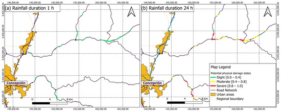 Potential states of physical damage associated with failure probability on cut slopes of a section of a highway that connects Chillán to Concepción for a 100-year return period with rainfall durations of (a) 1 h, and (b) 24 h.