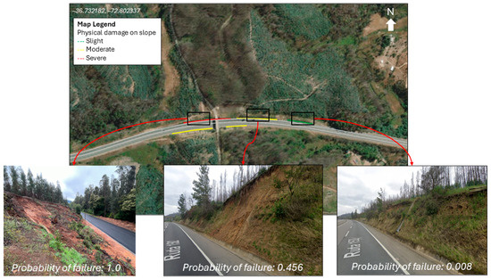 Figure 6 shows a section of the road connecting Chillán and Concepción, illustrating these three states of damage associated with precipitation events with a return period of 100 years. These were correlated with available Google Street View imagery from May 2024; severe damage is associated with a completely failed cut slope, moderate damage corresponds to a slope exhibiting superficial failure similar to an erosion process, and slight damage indicates no apparent failure. It is important to note that this procedure was conducted primarily to verify the operational functionality of the proposed methodology and does not constitute a formal validation, as specific information regarding the causative rainfall events and the precise dates of the failures observed in the photographs was unavailable.