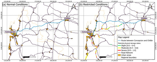 Connection route between Concepción-Chillán under (a) normal conditions and (b) altered conditions resulting from simulated precipitation scenarios (T = 100 years, duration from 1 to 24 h).