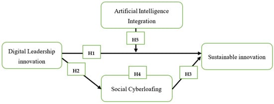 Despite its relevance, critical gaps remain. A contextual bias exists, as most studies focus on large corporations, neglecting SMEs in emerging economies [34]. The pathways through which digital leadership influences well-being and innovation are underexplored, and validated measurement tools for sustainability-oriented digital leadership are scarce. To address these gaps, this study introduces a novel measurement scale that integrates dimensions like digital inclusion, well-being advocacy, and ethical AI deployment, adapting items from established scales [35] to offer a comprehensive tool for research and practice. While research on digital leadership addresses inclusion and well-being, its specific influence on social cyberloafing is underexplored. Emerging evidence suggests a strong link: empowering leadership reduces cyberloafing by satisfying psychological needs like autonomy and competence [36]. Similarly, responsible leadership negatively impacts cyberloafing by heightening employees’ felt obligation [15]. Findings from the JD–R model also indicate that job engagement (fostered by supportive leadership) negatively correlates with cyberloafing [37]. Together, this suggests digital leadership can curb social cyberloafing through empowerment, ethical stewardship, and engagement. Thus, we propose: