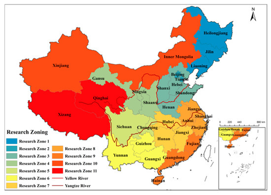 We analyze data from 31 provincial-level administrative regions in China (excluding the Hong Kong and Macao special administrative regions and Taiwan). The country is divided into 11 research regions (Figure 1), considering watershed divisions, geographical location, climatic differences between the north and south, and existing industrial structures. Research zone 11 is located on the first step of China’s topography, including the source areas of the Yangtze River, the Yellow River, and the Lancang River. It is focused on ecological conservation and exhibits relatively lagging economic development. Research zones 4 and 10 are situated in Northwest China, covering the upper and middle reaches of the Yellow River and inland river basins. These vast regions serve as major reserve areas for developing arable land but experience relative water scarcity. They are also designated as major receiving areas for the proposed Western Route of the South-to-North Water Diversion Project. Research zones 2 and 3 are primarily located in the North China Plain, encompassing the Hai River Basin and the middle and lower reaches of the Yellow River. These areas are economically developed, topographically flat, and water-deficient. They serve as key receiving areas for the Eastern and Central Routes of the South-to-North Water Diversion Project. Research zones 5, 7, and 8 fall within the Yangtze River Basin. These regions are rich in water resources and economically prosperous, forming vital growth poles in China’s national economy. Research zone 6 lies in southwest China and includes parts of the Southwest River System, the Pearl River Basin, and the Wujiang River, a tributary of the Yangtze River. This region functions as a strategic gateway for exchanges with South Asian countries. Research zone 9 is located along the southeast coast and covers parts of the Pearl River Basin and the Southeastern River Basins. This region has significant locational advantages and is economically advanced. Research zone 1 is situated in the Songliao Plain, within the Songhua and Liao River Basins, and is focused on primary and secondary industry development.