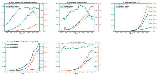 At different stages of China’s economic development, the driving contributions of production factors to economic growth have undergone significant shifts. From 1949 to 2023, the roles of labor, land, investment, energy, and water resources in primary, secondary, and tertiary industry have gradually diverged (Figure 3).