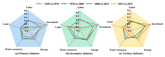 Primary industry development has shifted from dual reliance on investment and labor to dual reliance on investment and energy. Water resources and arable land have consistently served as important drivers of agricultural development, while the labor contribution has gradually diminished due to mechanization [29]. However, between 1949 and 1978, water conservancy infrastructure was relatively underdeveloped, and primary industry growth relied heavily on investment and labor. After 1978, farmland irrigation and water conservancy infrastructure expanded substantially, making water resources the third most important contributing factor after investment and labor. During the same period, with the implementation of the household contract responsibility system, the output elasticity coefficient of land reached its peak, ranking below the contribution of water resources but above that of energy. Since the beginning of the 21st century, the advancement of modern agriculture has facilitated the large-scale application of mechanization, and the role of energy has gradually increased, becoming the second most important driver after investment. Irrigation infrastructure also expanded, further increasing the contribution of water resources, while the elasticity coefficient of labor turned negative. Since 2013, stringent water resource utilization caps have been implemented in northern China [30]. Thus, the contribution of water resources to primary industry has declined to levels similar to those seen in 1949–1978, with an elasticity coefficient of 0.07. Investment and energy have since become the dominant drivers of primary industry development.