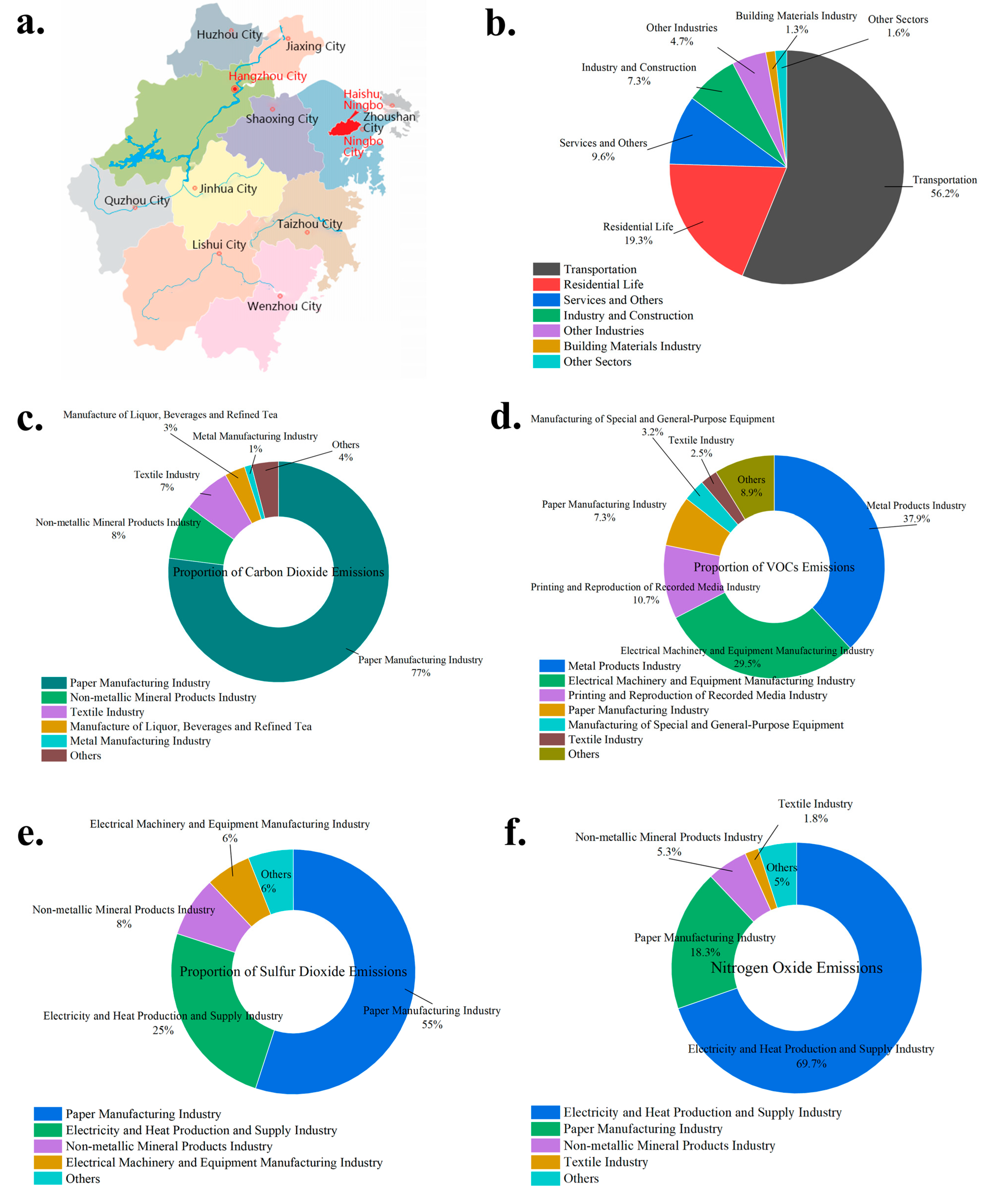Figure 1a). In recent years, industrial restructuring and technological innovation in this region have driven shifts in energy consumption patterns; however, issues such as high total carbon emissions and insufficient synergy between pollutants and carbon reduction governance persist. According to data from the Zhejiang provincial government and relevant departments, the main sources of carbon emission in this region are four major sectors: industry, transportation, buildings and waste treatment. The industrial and transportation sectors account for the largest proportions of emissions (