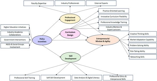 This study explored the relationships between Policy Incentives (PC), Professional Engagement (PE), Curriculum Design (CD), Skill Development (SD), and Entrepreneurial Mindset and Agility (EMA). All measurement scales demonstrated strong reliability (Cronbach’s α > 0.7) and validity. Descriptive and correlation analyses revealed strong positive relationships between PC and all other dimensions. A multiple mediation regression analysis confirmed that PC significantly and positively influences PE, CD, SD, and EMA. Additionally, PE, CD, and SD each have a significant impact on EMA, and they partially mediate the relationship between PC and EMA. These findings indicate that policy incentives affect EMA both directly and indirectly, through professional engagement, curriculum design, and skill development.