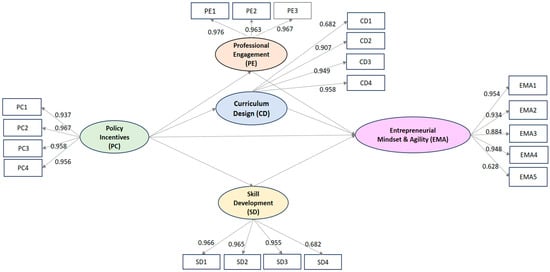 Table 3 presents the reliability and validity statistics for each construct. The Cronbach’s Alpha coefficients for all scales exceed the commonly accepted threshold of 0.70, indicating excellent internal consistency reliability. Specifically, Policy Incentives (α = 0.966) and Professional Engagement (α = 0.967) demonstrate very high reliability, while the remaining constructs—Curriculum Design (α = 0.819), Skill Development (α = 0.820), and Entrepreneurial Mindset and Agility (α = 0.858)—all fall well within the acceptable range. The cumulative variance explained by each construct exceeds 75%, with Policy Incentives (91.10%) and Professional Engagement (93.85%) showing particularly strong explanatory power. This suggests that the items effectively capture the underlying dimensions of each construct.